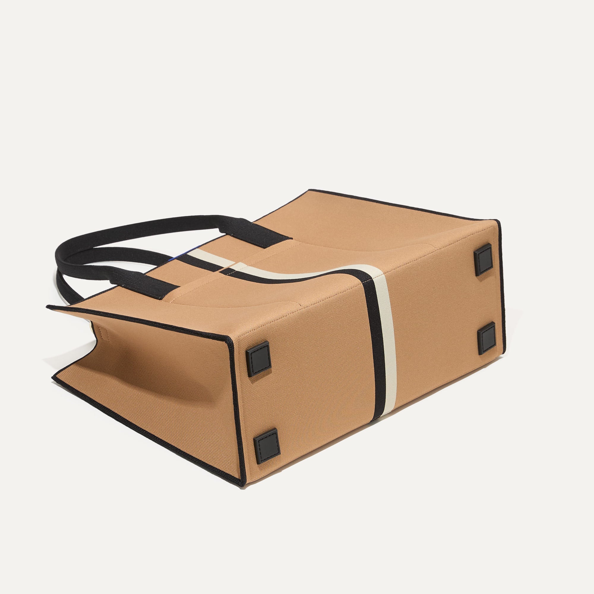 • Boxy. lightweight design in light camel with two center stripes in black and ivory. and a secure zipper closure.
